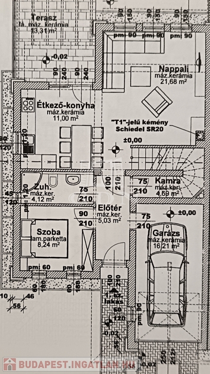 földszint: amerikai konyhás nappali, spájz, hálószoba, fürdőszoba mosdóval, közlekedő, garázs.
