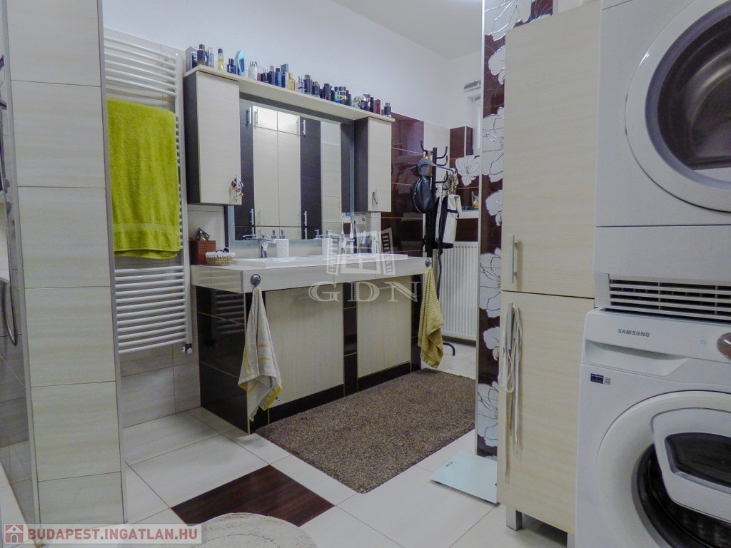 A nagyobbik lakrészen amerikai konyhás (kamrával), étkezős nappali, 4 hálószoba, 2 fürdőszoba, wc, infraszauna, gardrób, nagy terasz lett kialakítva két szinten.