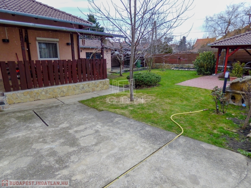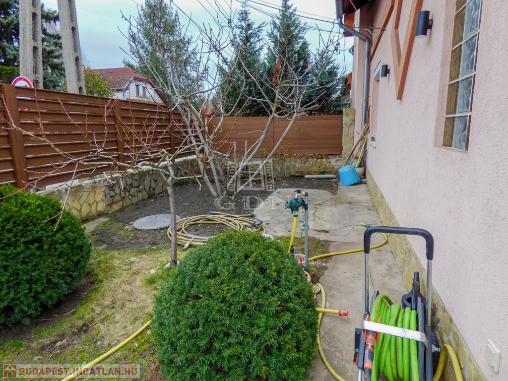 A zárt udvaron 3 autóval meg lehet állni, ebből 2 fedett, az elektromos hálózat felbővített (3*16 A), a kertben egy nagy terasz (20 nm), szaletli (16nm), tároló (20 nm), bográcsozó kapott helyet. Az öntözés fúrt kútról megoldott, a kerítés gondozásmentes.