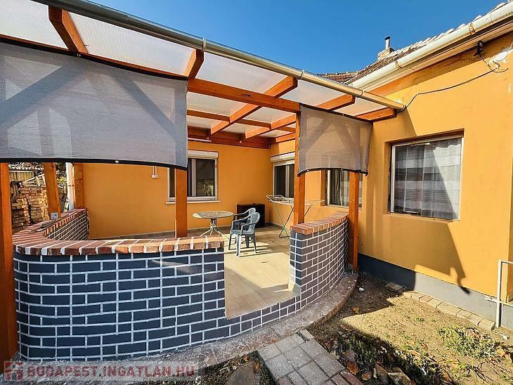 A házrészhez tartozik egy 20 nm-es nagy fedett terasz valamit egy szerelő aknával ellátott garázs.