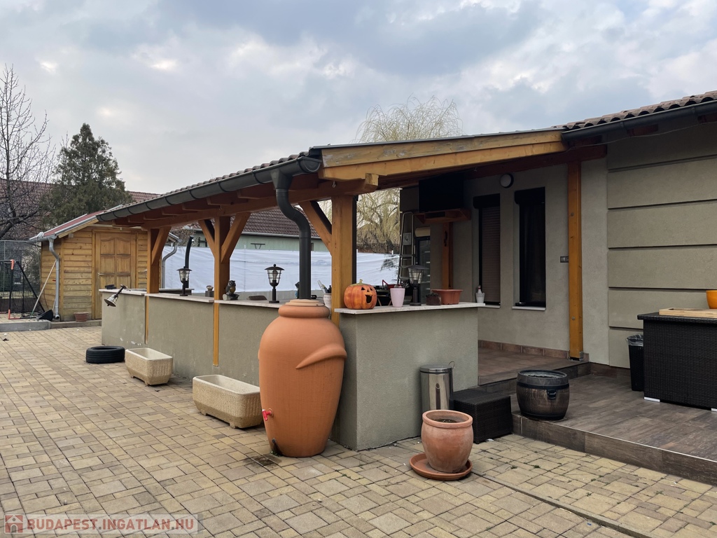 A fedett terasz 90 m2, mely járólapozva van, kiváló kialakítással rendelkezik.