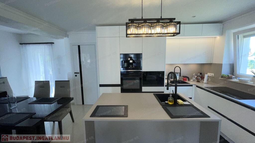 Modern, gépesített amerikai konyha és étkező egyedi gyártású bútor, Electrolux készülékek, 5 zónás indukciós főzőlap