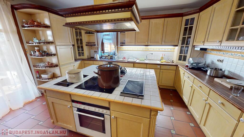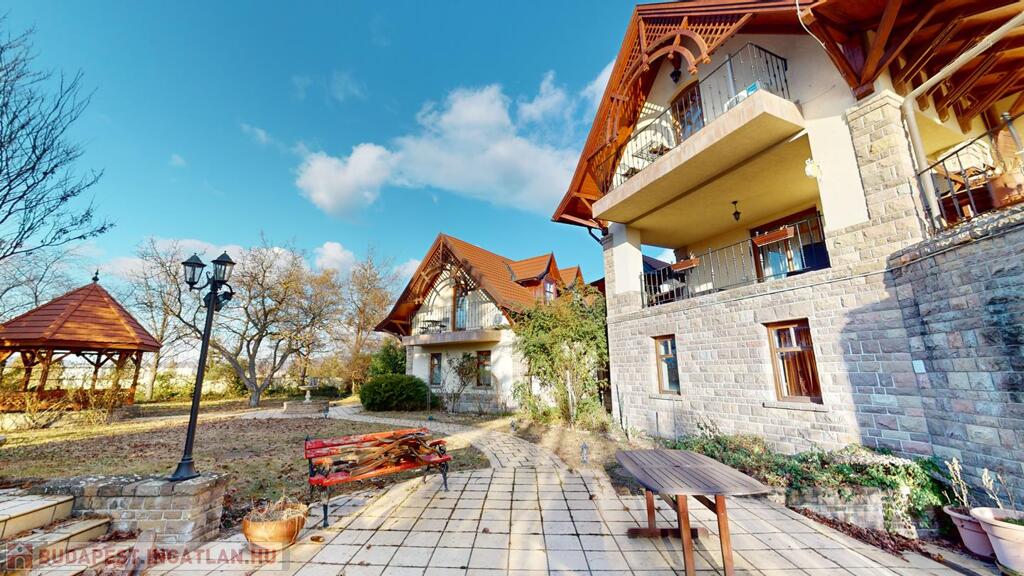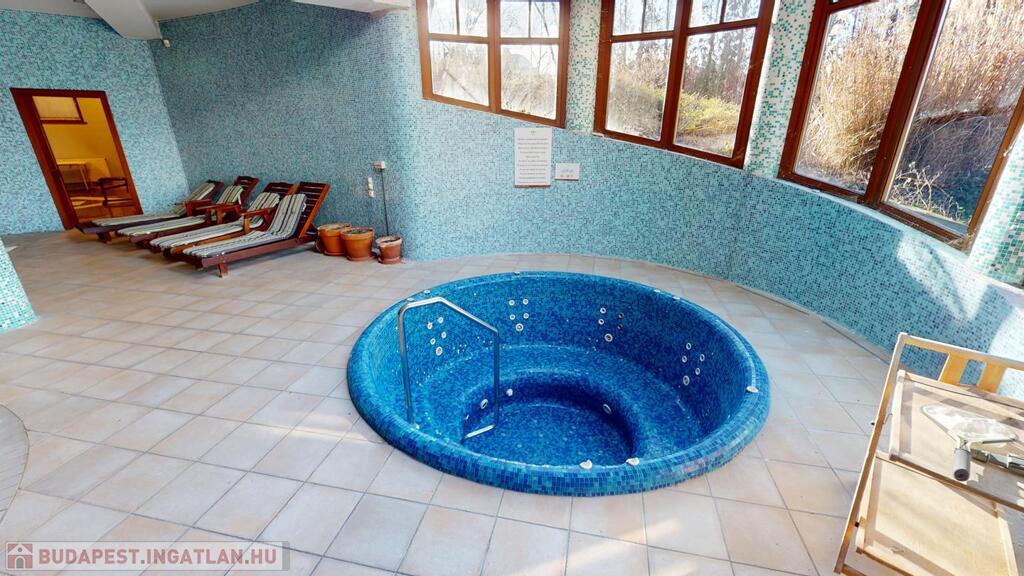 parkosított kert- filagóriával, riasztó, automata garázs illetve bejárati kapu, napkollektor a medencéhez és a használati melegvízhez, jakuzzi, klímák
