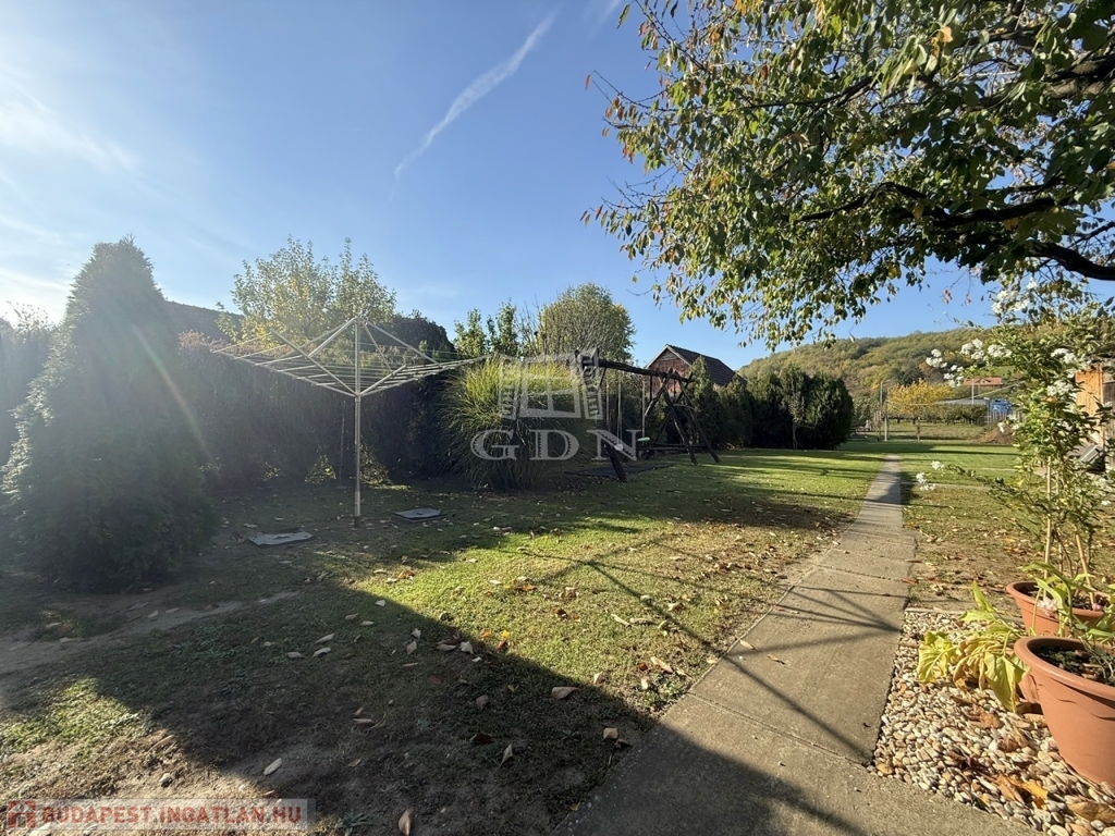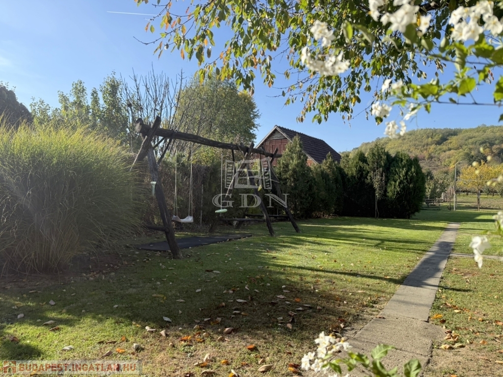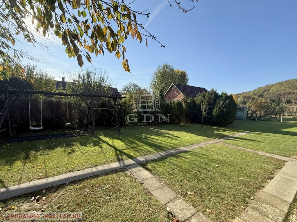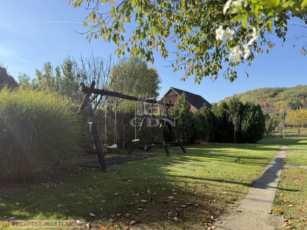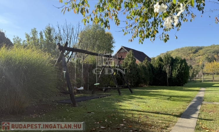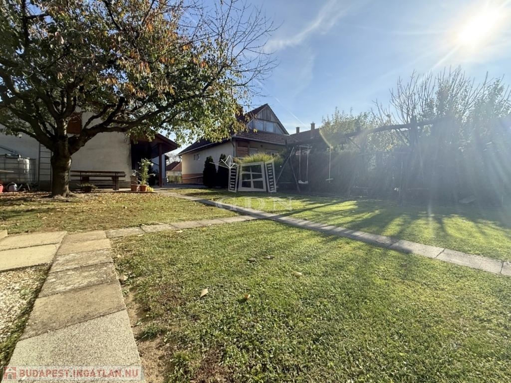 A terület cca. 800 m2, melyen szépen elkülönülnek a pihenésre és játékra szolgáló részek a veteményes és gyümölcsfák birtokától.