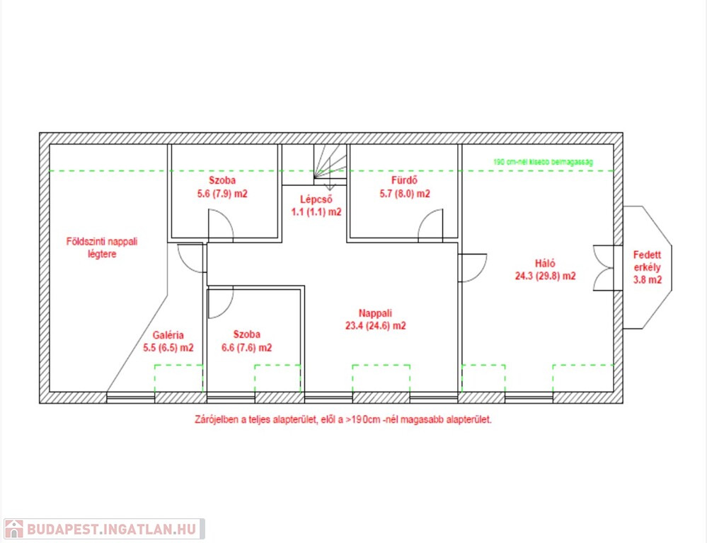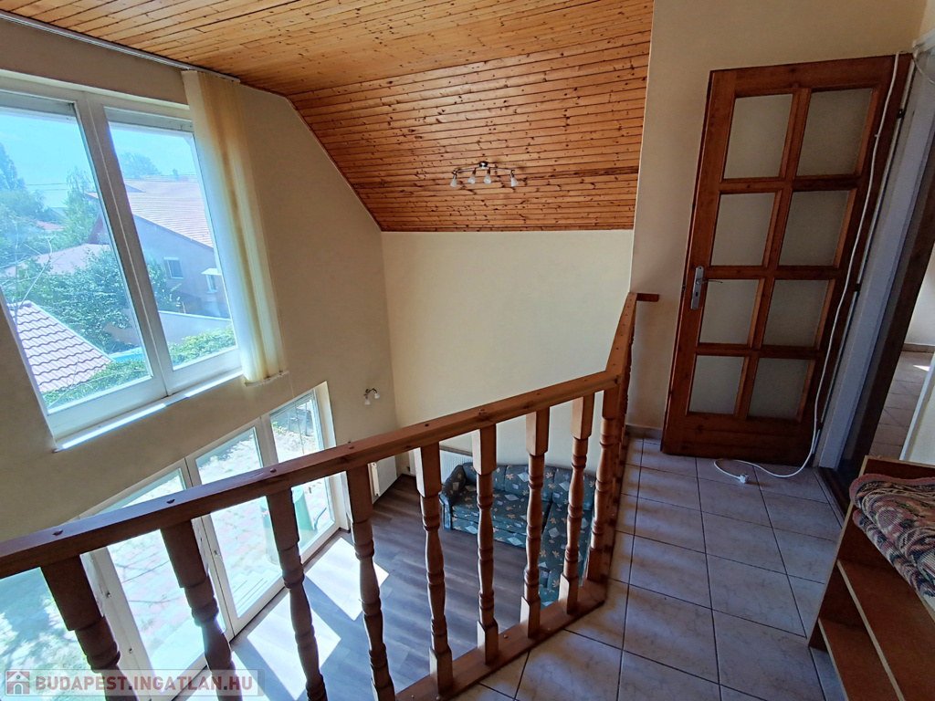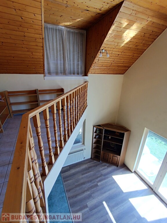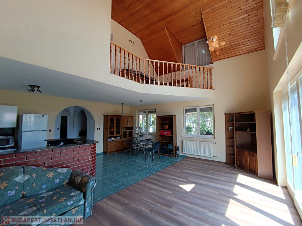 Az emeletre felérve a galériáról letekinthetsz a nappalira, ami igazán impozáns, hiszen a belmagasság itt eléri a 6 métert. Ezen a szinten egy második nappali is található konyhával, három hálószobával és egy fürdőszobával, így a fenti lakrész akár önálló lakásként is használható. A melegvíz ellátásról itt egy villanybojler gondoskodik, míg a földszinten egy kombi gázkazán biztosítja a komfortot.