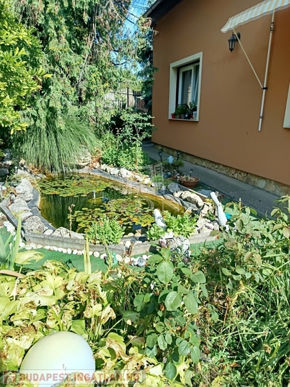 Az ingatlan egyik dísze a kis kerti tó, benne a gyönyörű színes halacskákkal.