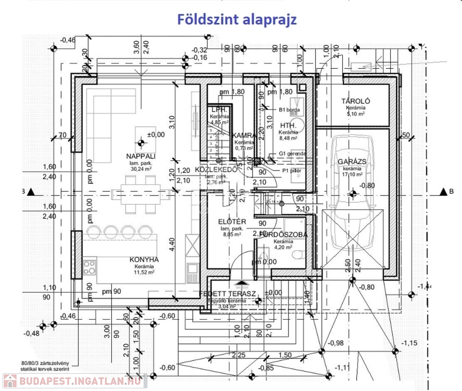 AZ ÉPÜLET beton sávalapra épül. Főfalak 30 cm porotherm téglából készülnek +15 cm dryvit szigeteléssel. Válaszfalak 10 cm tégla, gépi vakolással. A külső nyílászárók műanyag szerkezetűek, 3 rétegű, 6 légkamrás üvegezéssel ellátva. A födémen 30 cm közetgyapot szigetelés. A tető beton cserép fedéssel készül. A ház áram ellátása 3x25 Amper.