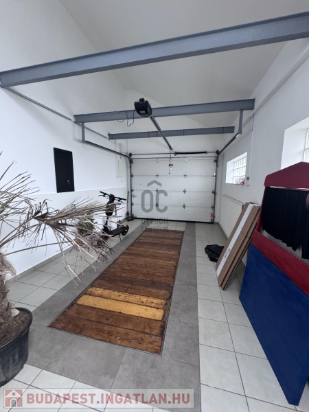 Az utca fronti elektromos kapun belépve, több autó számára elegendő térkövezett rész került kialakításra, és további 1 autó számára elegendő fűtött aknás garázs szolgálja a lakok kényelmét. A fűtött garázs közvetlen kapcsolatban áll a lakórésszel, garázsból bejutunk a másodlagos konyhába " mosókonyha helységbe" , ahonnan a hátsó terasz és kert irányába is ki biztosított a kijárás.