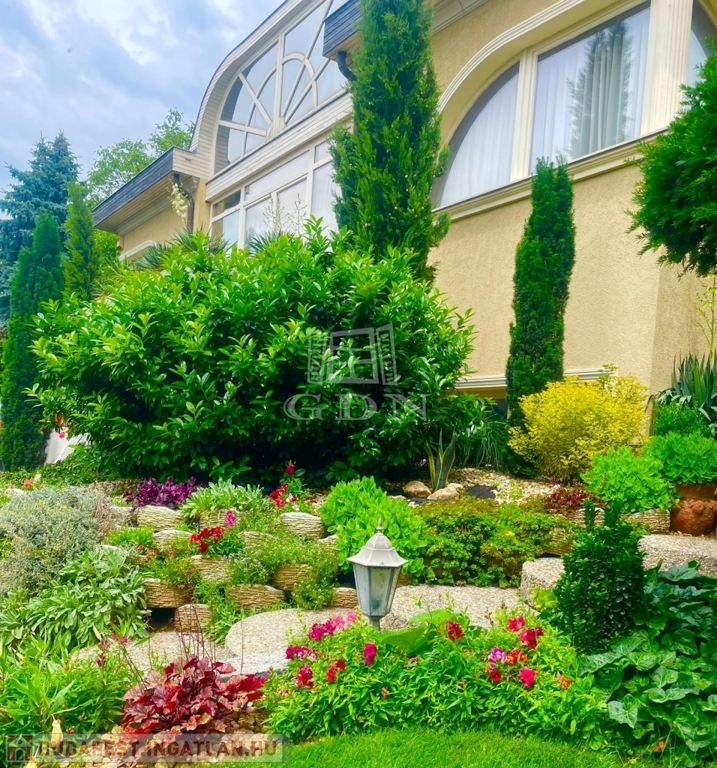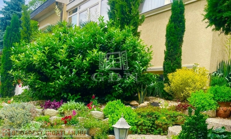 A parkosított kertben automata locsolórendszer és medence található – igazi kertvárosi oázis érett növényállománnyal.