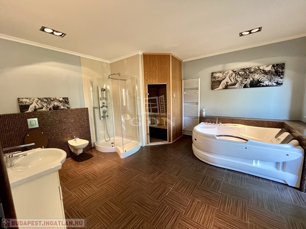 Kivételes lehetőséget kínálunk Érd legkeresettebb részén: egy önálló, 240 m²-es családi házat, amely egy 1300 m²-es parkosított telken helyezkedik el, tele extra kényelmi funkciókkal: 30 m²-es medence, szauna (infra- és finnszauna), jakuzzi, óriási gardrób szoba, fedett terasz, beépített szekrények, valamint külön szülői lakrész intim terasszal és fürdővel.