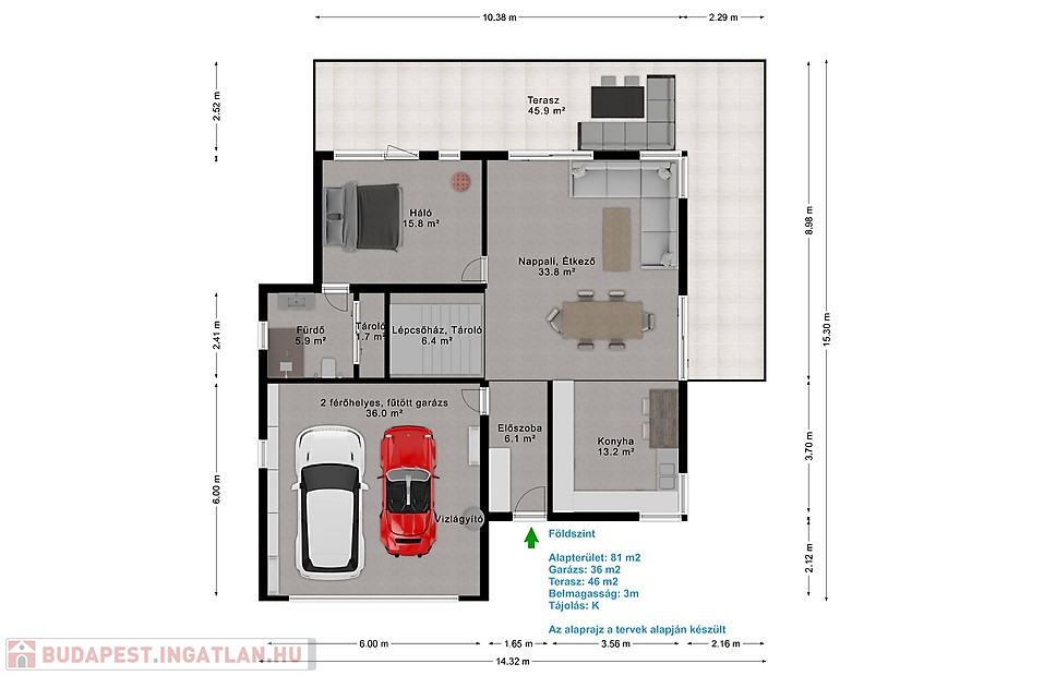 A 6x 6 méteres garázs két autó számára kényelmesen parkolható, továbbá extra tárolási helyet biztosít a teljes hosszában plafonig beépített polcrendszer.
