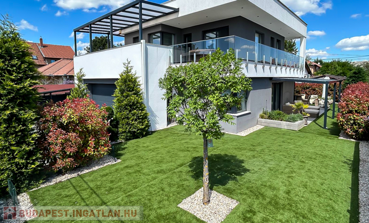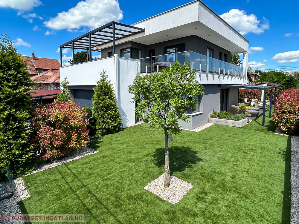 A modern stílusú családi ház 2020– ban épült egy 537 m2-es telekre, melyet mára már szépen megnőtt bokrok, dísznövények tarkítanak. A kertet csepegtetőrendszer tartja frissen.