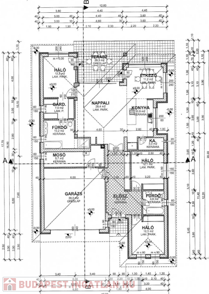 A ház helyiségei: 3 háló (12.2 m2, 12.1 m2, 12.1 m2) + nappali-konyha-étkező (50.5 m2) + 2 fürdő (10.2 m2, és 4.8 m2) + gardrob (7m2) + garázs (36 m2) +mosókonyha-kazánház (9.5m2 ) + gardrob (7 m2) , + közlekedő+gardrob (16.7m2)+ hátsó, kertkapcsolatos terasz (29.3 m2,ebből fedett kb 20 m2)