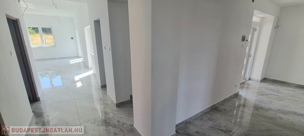 A nappaliban, a lépcsőházban és az emeleti közlekedőben egyező hidegburkolat, 8mm nagyméretű kerámia 120x60cm méretben. Szobákban laminált padló.
