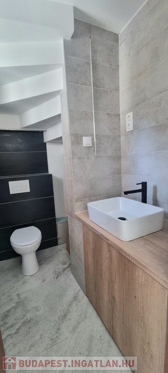 Az alsó szinten tágas amerikai konyhás nappali, 2 hálószoba, káddal és épített zuhannyal felszerelt fürdőszoba, külön wc mosdóval, gépészet és egy kb 40 nm-es terasz kapott helyet.