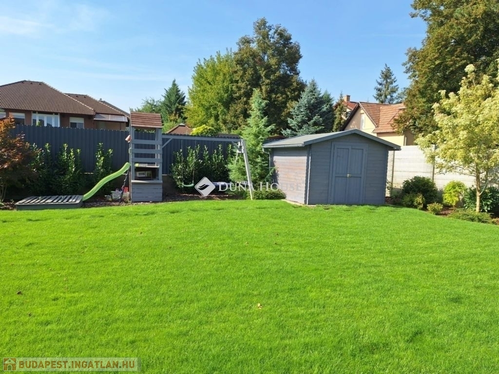 - Hátsó kertben játékterület + fa tároló / kerti ház