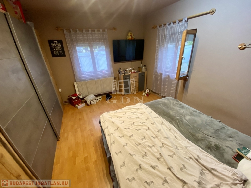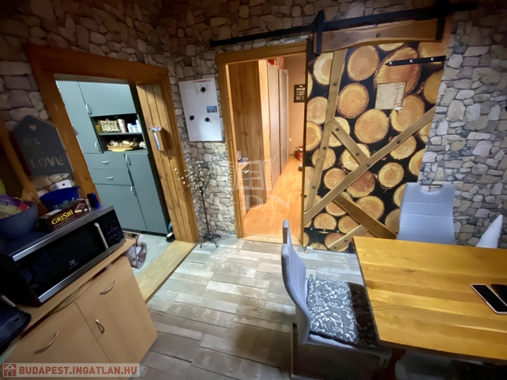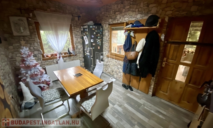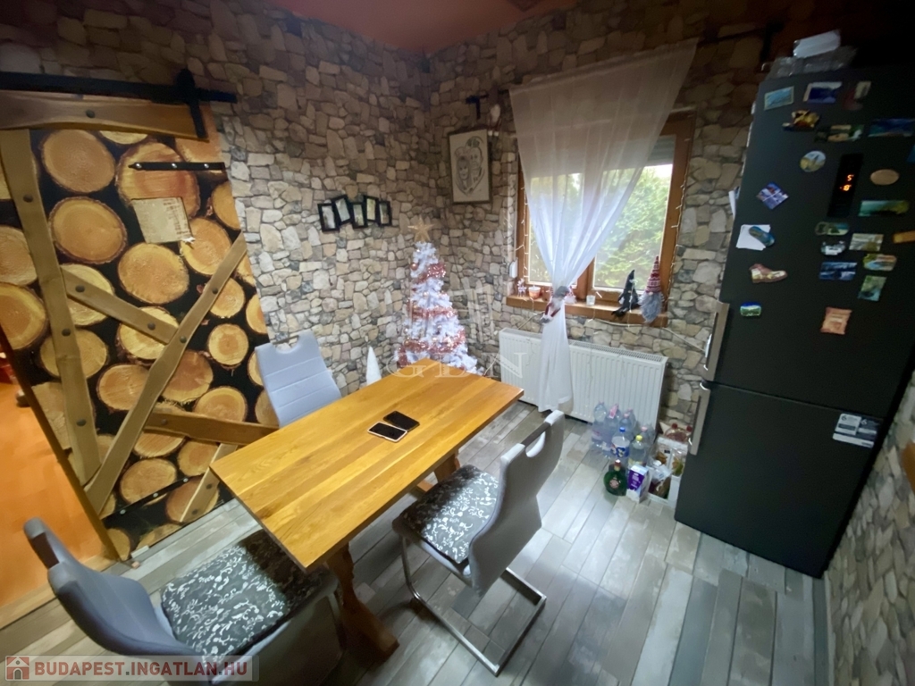 A teraszról az előszobába lépve került kialakításra az étkező, ahonnan nyílik egy szoba, illetve a konyha, melyben iparossal, egyedileg méretre készített konyhabútor található. A konyhából nyílik a fürdőszoba illetve még egy szoba. A fűtést gáz cirkó rendszer biztosítja.