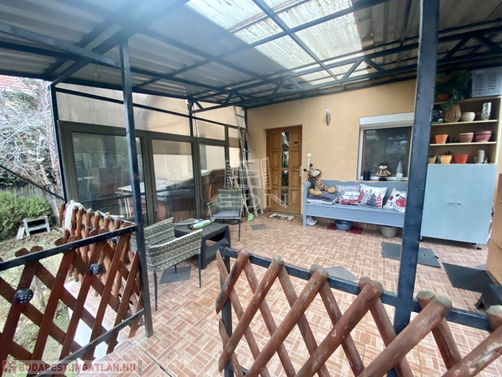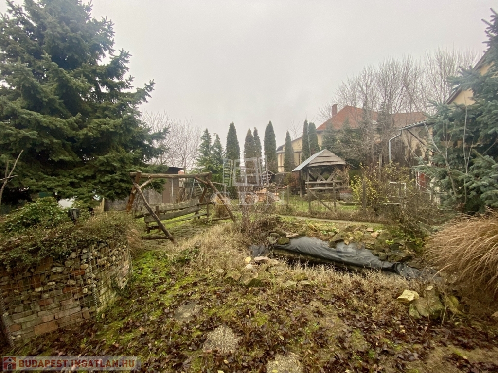A kert igazi különlegesség: több, pihenésre alkalmas rész került kialakításra, keményfából épített fedett kiülővel, dupla gépkocsi-beállóval, kerti tóval, valamint gabion kerítéssel és kövekkel díszített magas ágyásokkal, örökzöld növényekkel. A kellemes hangulatról 2 db hintaágy is gondoskodik. A magas növényzettel körbevett telek teljes intimitást biztosít, elzárva a külvilágtól.