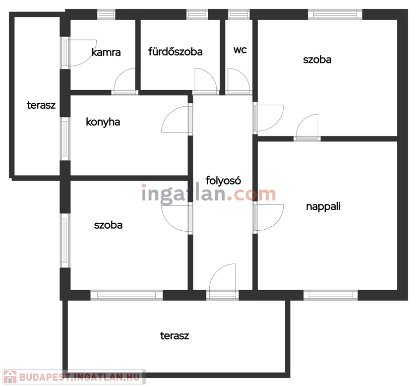 Az ingatlanban 3 szoba, konyha, kamra, és külön fürdőszoba- wc található. A szobák különállóak, a folyósóról nyílnak.
