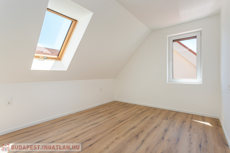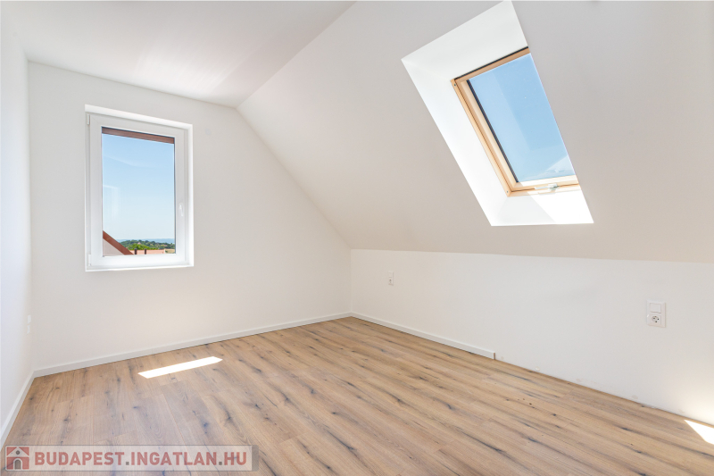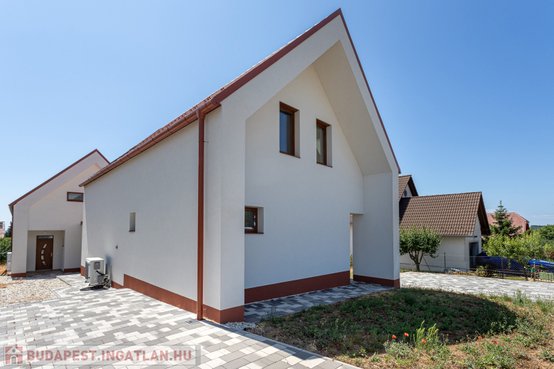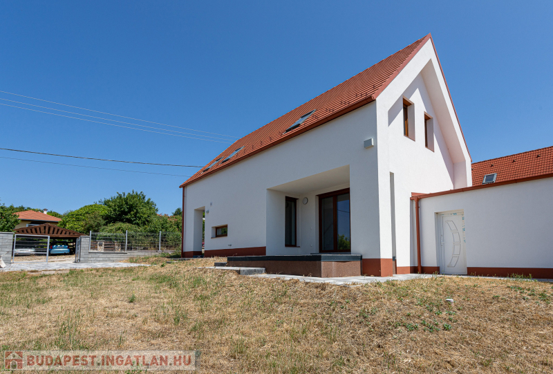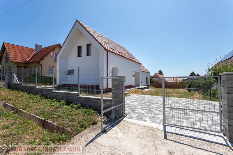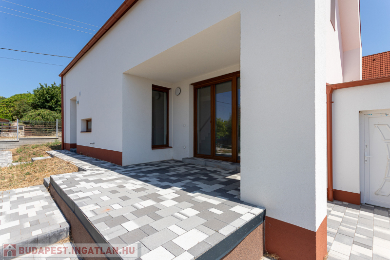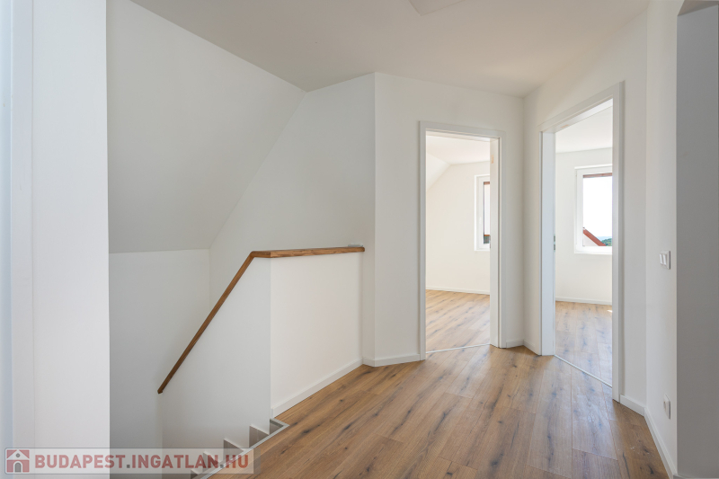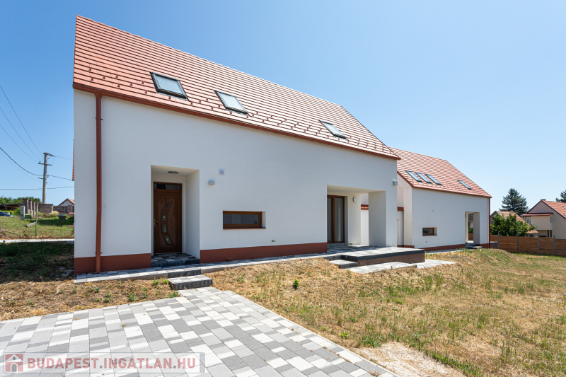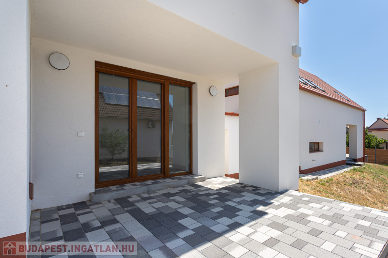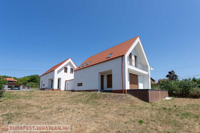 Az udvar felőli épület 132 m2-es, 31 m2 terasz, 7 m2 erkély és 573 m2. telekrésszel rendelkezik. Már elkelt! Az utca felőli épület 127 m2-es, 14 m2 terasz és 331 m2. telekrésszel rendelkezik, ára: 139,9 millió Ft. Beépített, gépesített konyhabútor. Beépített szekrények. Riasztó, minőségi burkolatok, szaniterek, belső ajtók. Panasonic hőszivattyú biztosítja a padlófűtést és magasfali fan coil-ok a hűtést és a plusz fűtést. A használati meleg vizet villanybojler állítja elő. 3 rétegű üvegezésű homlokzati nyílászárók. Elektromos alumínium redőnyök. Árnyékolók a tetőtéri ablakokon. Elektromos kapuknak kiállás. 25 cm hőszigetelés a tetőtérben. 15 cm. hőszigetelés a homlokzati falakon. Napelem rendszer akkumulátorral előkészítve. Felszíni gépkocsibeállók. Saját, kerítéssel elválasztott kert, nagy terasz.