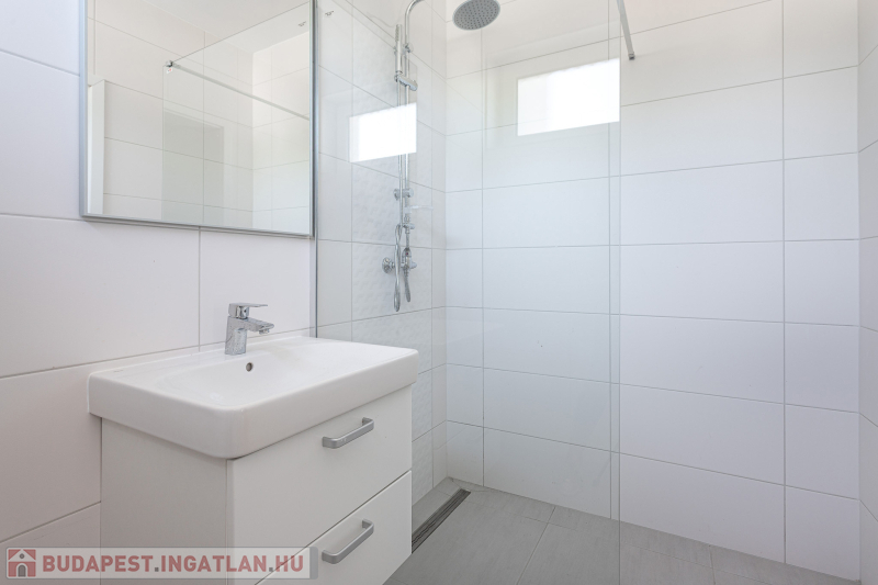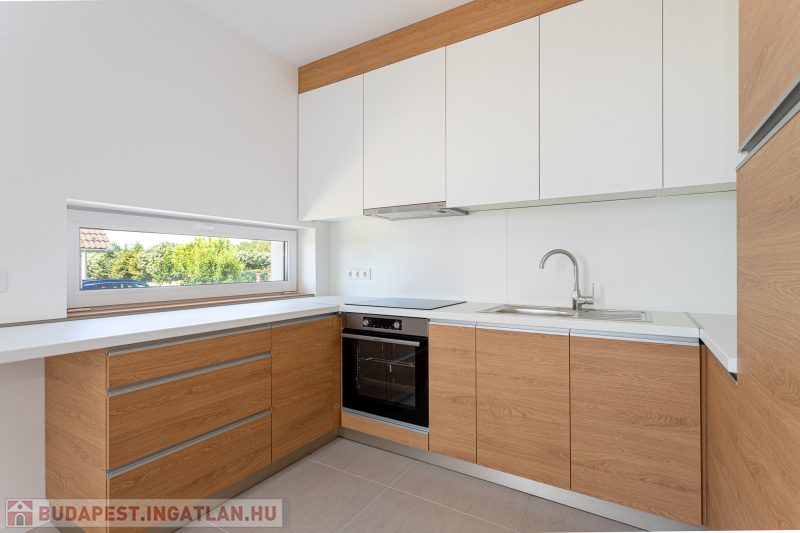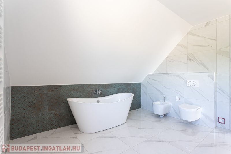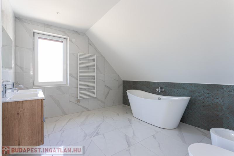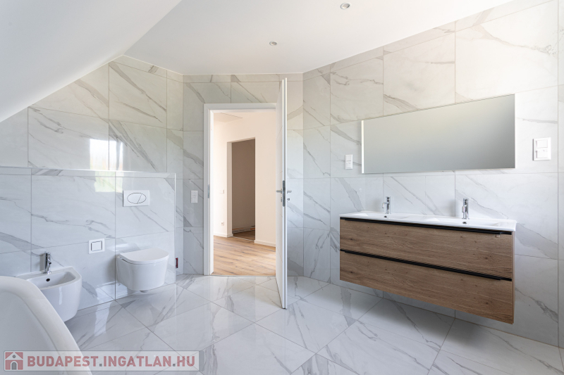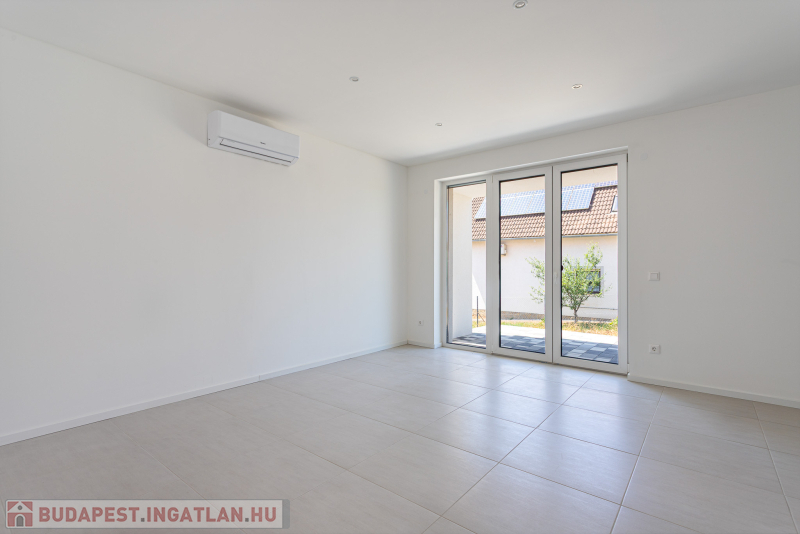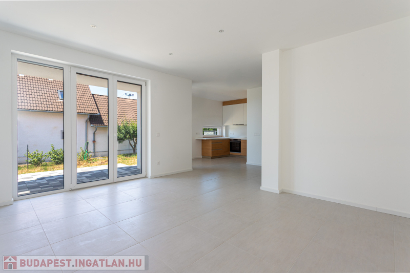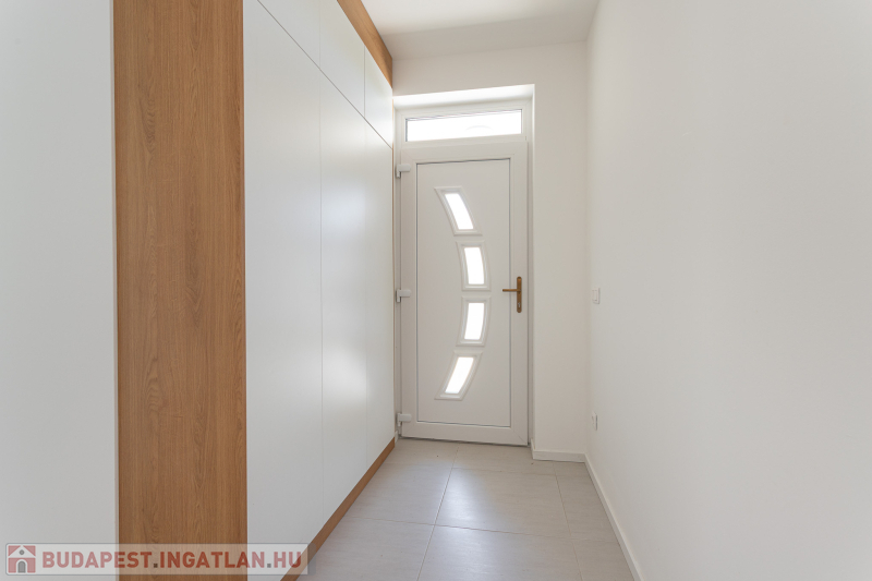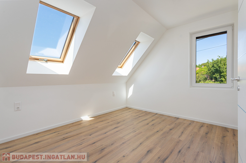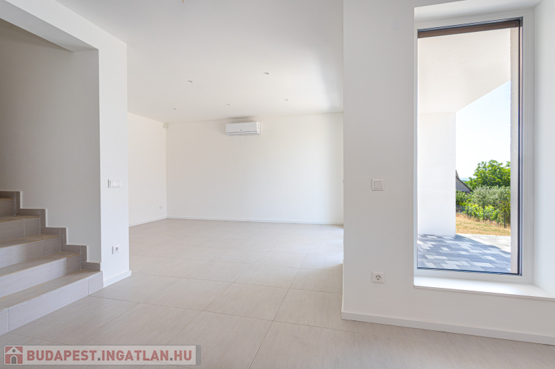 Az udvar felőli épület 132 m2-es, 31 m2 terasz, 7 m2 erkély és 573 m2. telekrésszel rendelkezik. Már elkelt! Az utca felőli épület 127 m2-es, 14 m2 terasz és 331 m2. telekrésszel rendelkezik, ára: 139,9 millió Ft. Beépített, gépesített konyhabútor. Beépített szekrények. Riasztó, minőségi burkolatok, szaniterek, belső ajtók. Panasonic hőszivattyú biztosítja a padlófűtést és magasfali fan coil-ok a hűtést és a plusz fűtést. A használati meleg vizet villanybojler állítja elő. 3 rétegű üvegezésű homlokzati nyílászárók. Elektromos alumínium redőnyök. Árnyékolók a tetőtéri ablakokon. Elektromos kapuknak kiállás. 25 cm hőszigetelés a tetőtérben. 15 cm. hőszigetelés a homlokzati falakon. Napelem rendszer akkumulátorral előkészítve. Felszíni gépkocsibeállók. Saját, kerítéssel elválasztott kert, nagy terasz.