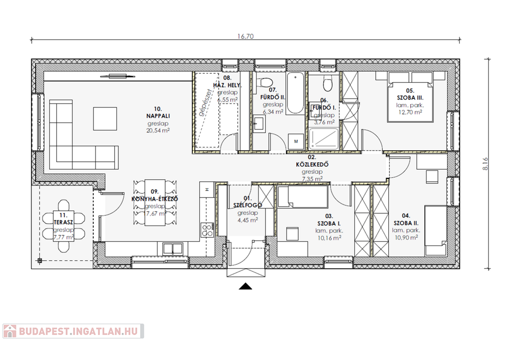 Gépészet: Modern, energiatakarékos hőszivattyús fűtésrendszer minden helyiségben padlófűtéssel, kiegészítve a hűtést szolgáló fan-coil rendszerrel.