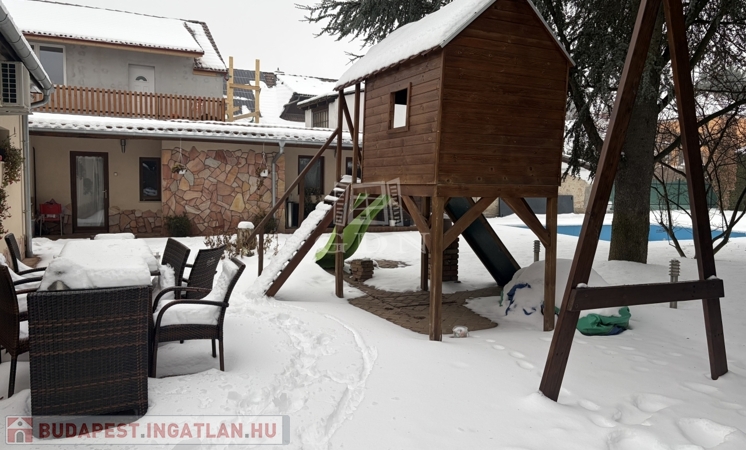 A gondozott nagy méretű kertben levő kerti búbos kemence, és a sütögető kiváló helyszíne a kikapcsolódásnak.
