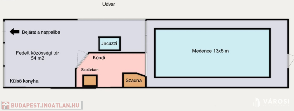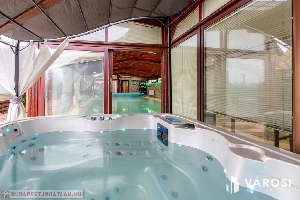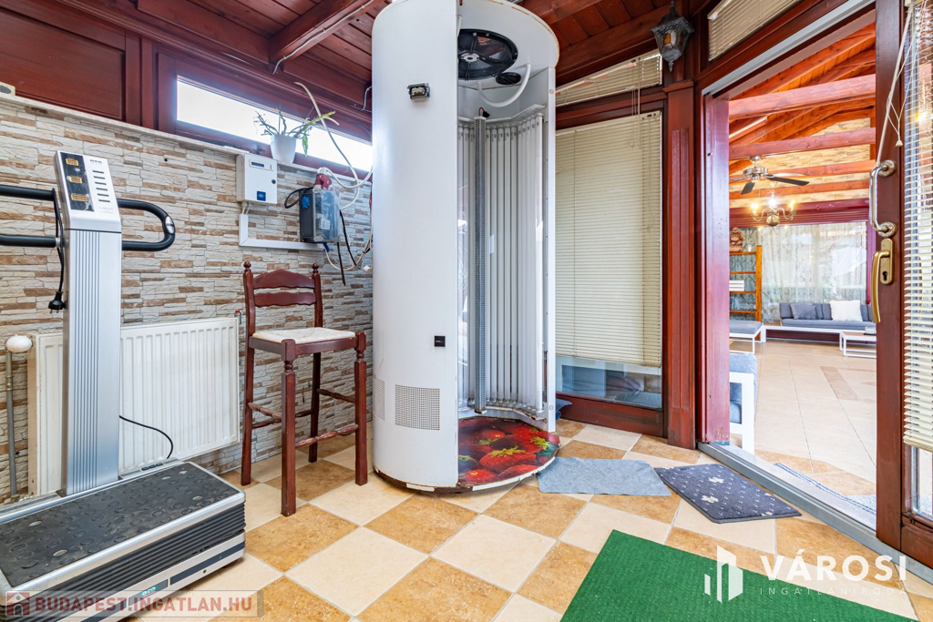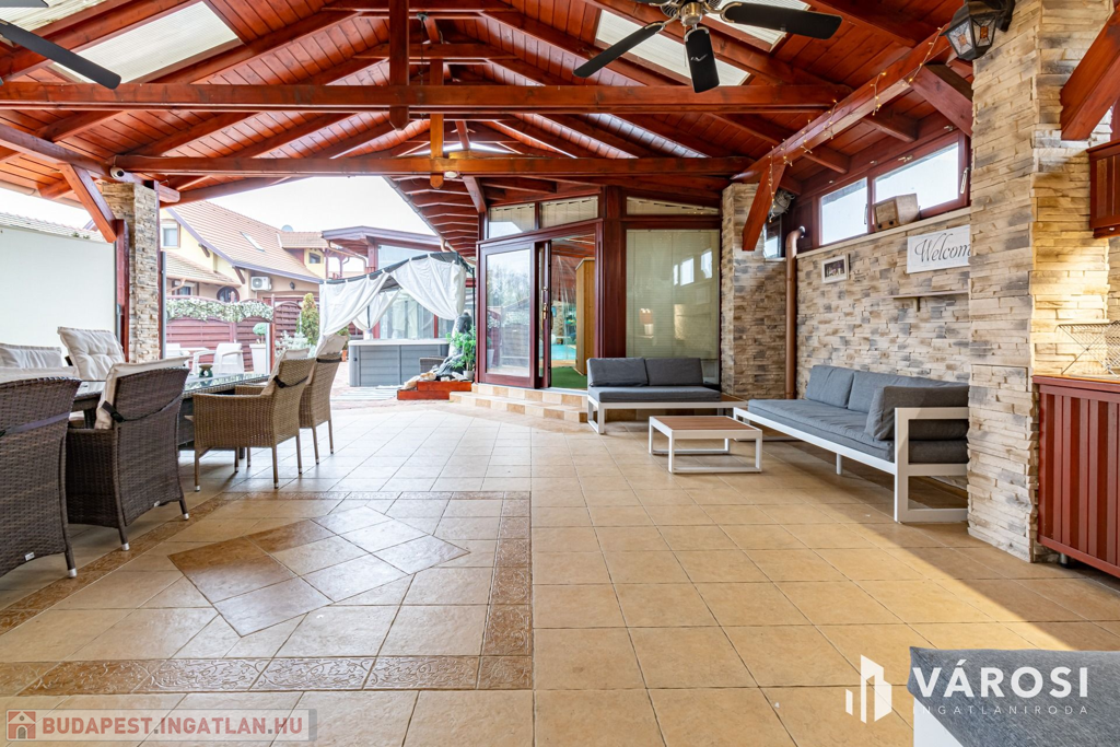 A rendezett udvarban több autó kényelmesen parkolhat, az elektromos kapun keresztül belépve pedig igazi privát oázis várja: fűtött medence, jacuzzi, szauna, szolárium, kerti sütögető, napozóágyak és egy hatalmas fedett terasz, amely egy teljesen felszerelt kerti konyhát és hangulatos pihenősarkokat rejt. Mindez olyan érzést nyújt, mintha minden nap nyaralna!