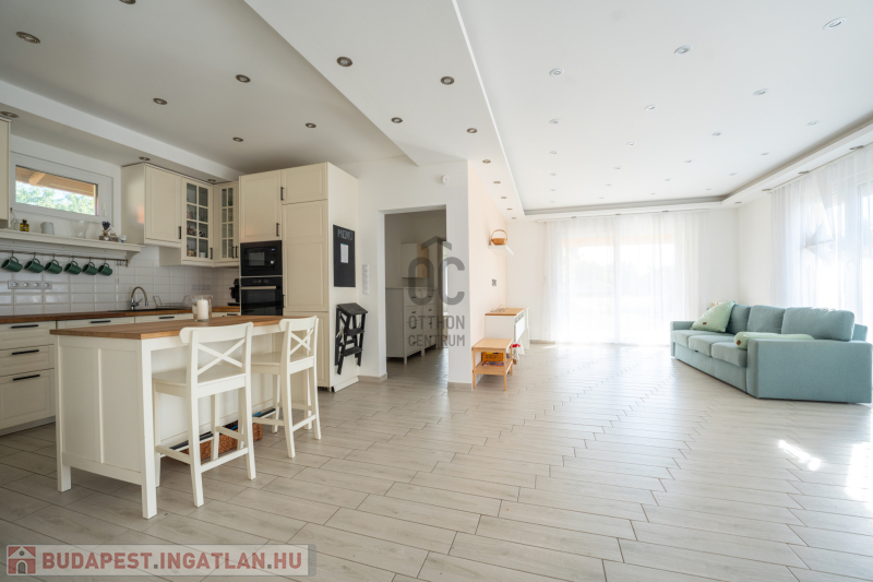 Az otthon elosztása tudatosan családközpontú: 4 hálószoba (szülői háló + három gyerekszoba), külön dolgozószoba, nappali, két fürdőszoba WC-vel (egy zuhanyzós, egy kádas), külön mosókonyha, tágas konyha-étkező, kamra és kertkapcsolatos, fedett terasz tartozik hozzá.