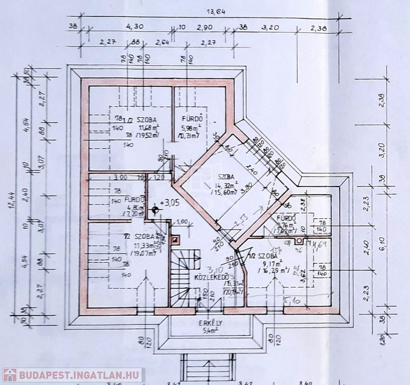 Tetőtér: 4 szoba, 3 fürdőszoba, erkély, közlekedő