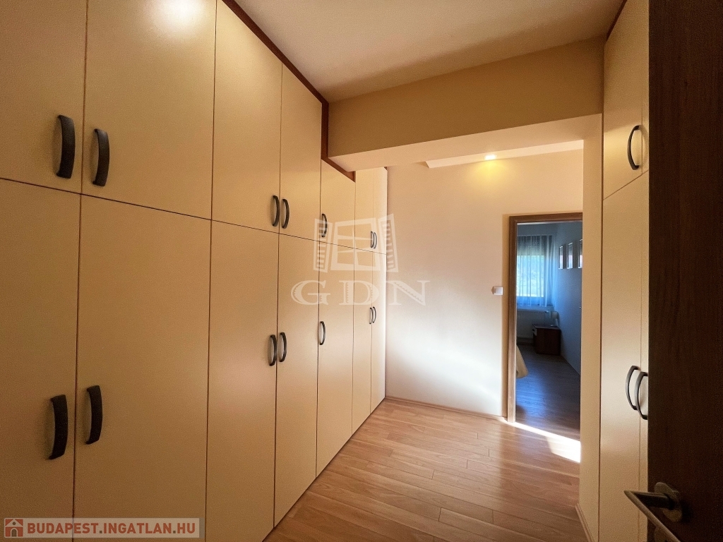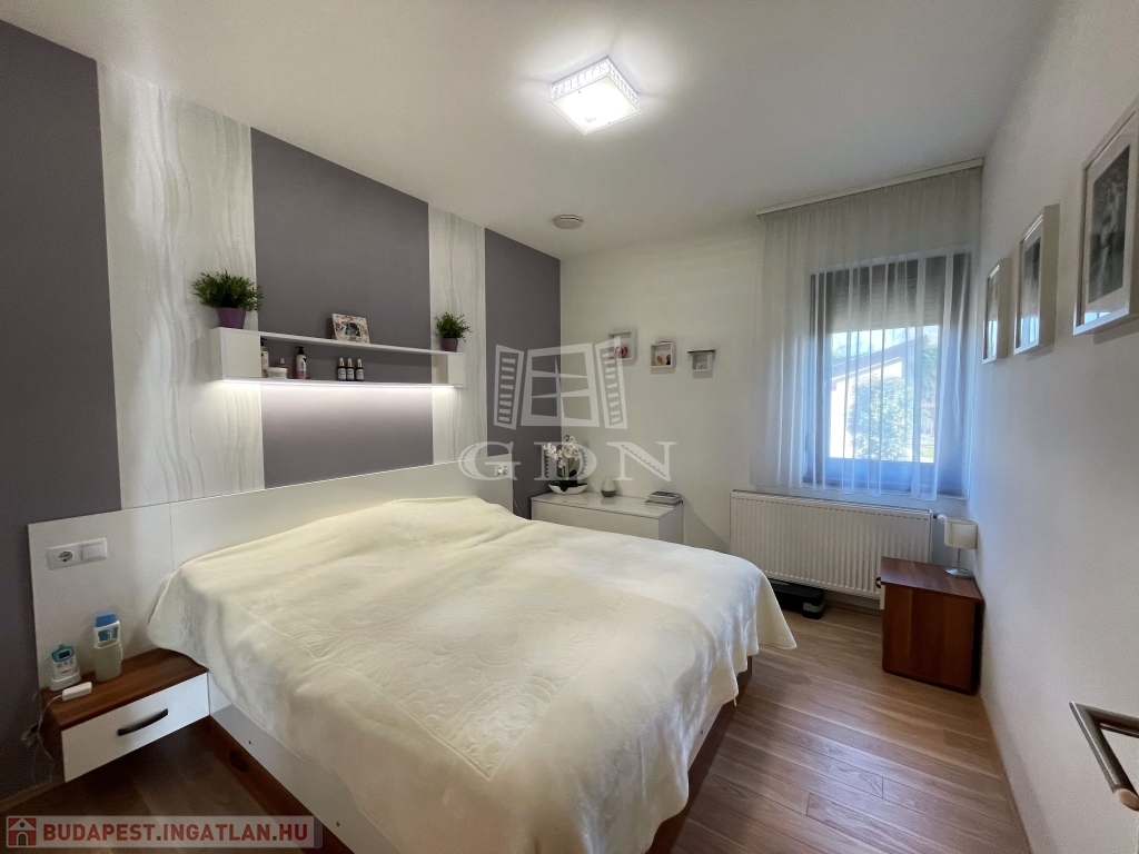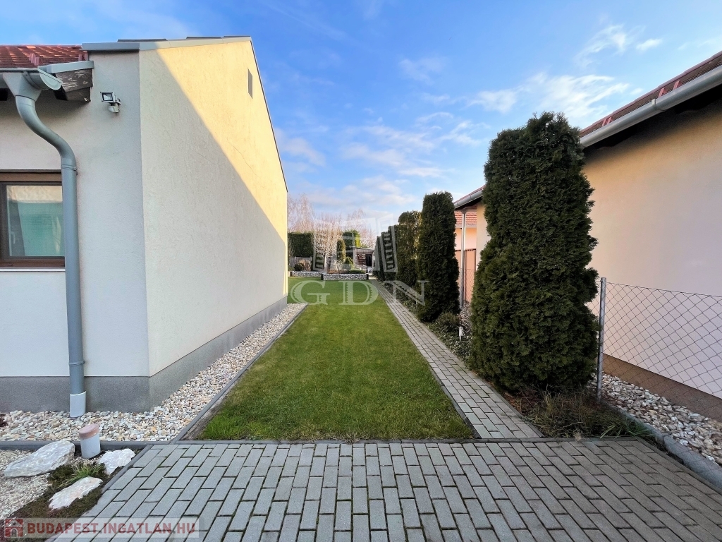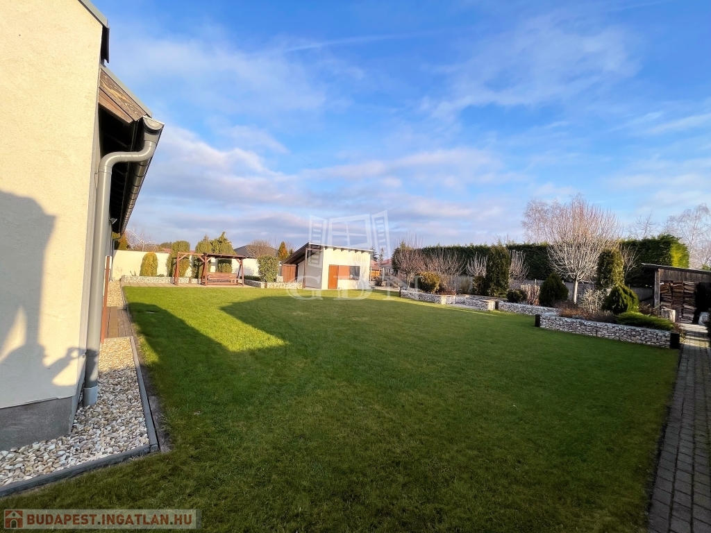 A kertben található még egy 20nm-es kis ház (2cm-es szigeteléssel) járolapozva a kerti eszközök tárolására illetve műhely lehetőséggel. Továbbá egy hintaágy+gyerek hinta illetve egy fedett, körbe zárt 10nm-es fatározó. A kert minden pontján biztosított az áramelérés, 5 helyen van vízcsap (ebből 2 DRV). A füves rész kivételével mindenhova került geotextília. Kb 100m2 a térkövezett felület ami az aszfaltútig kiér mind két kapunál.