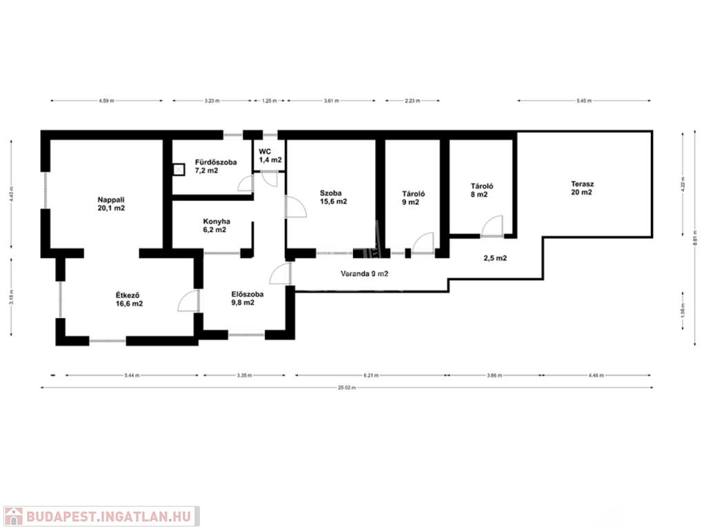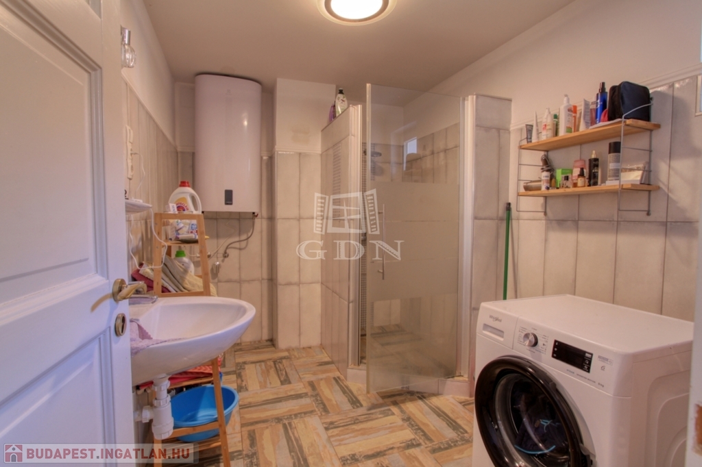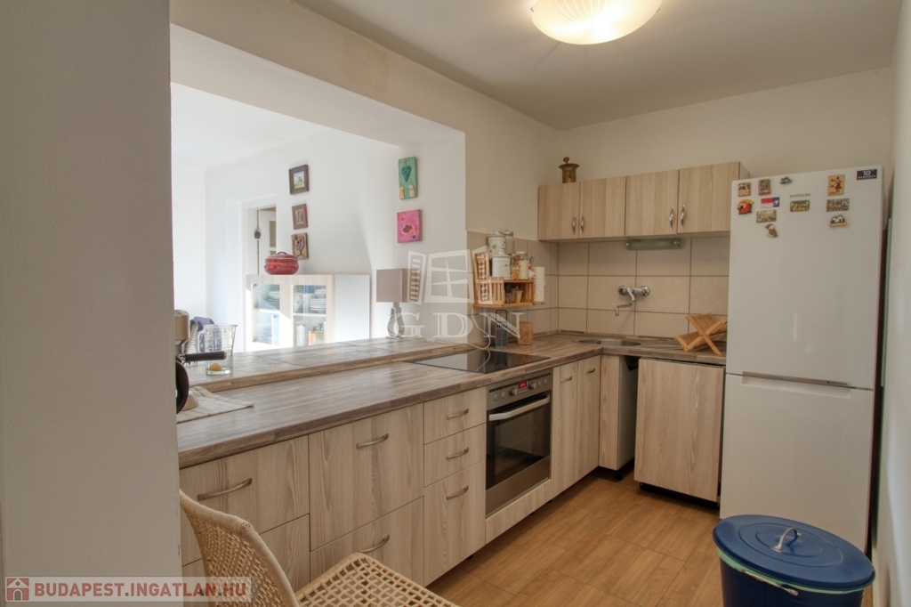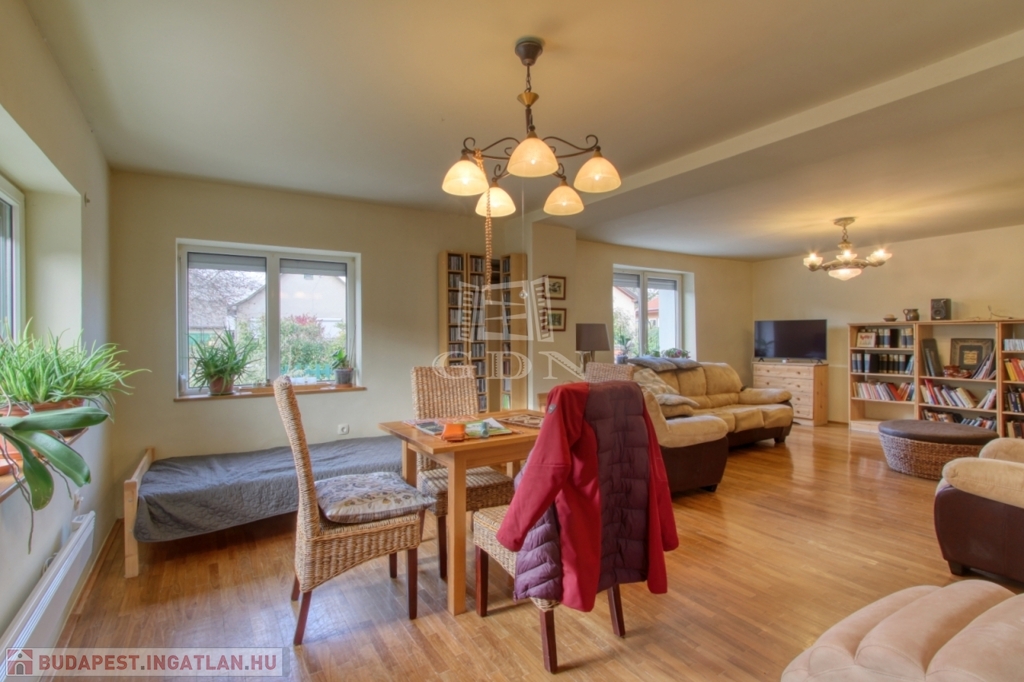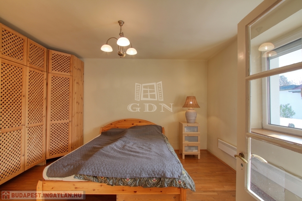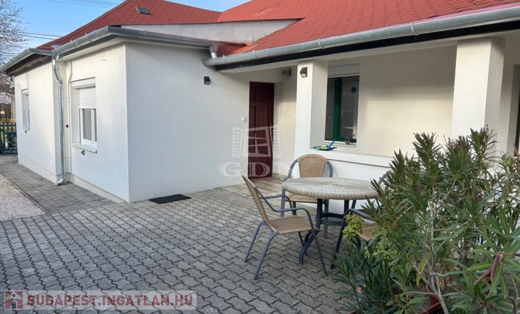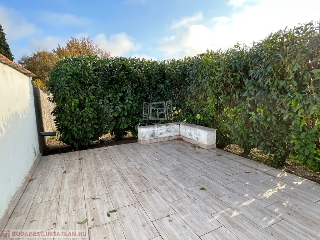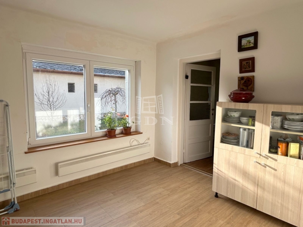 A ház 37 m2-es nappali-étkező, előszoba-étkező, konyha, fürdőszoba, wc, közlekedő helyiségekből áll. További hálószoba leválasztással kialakítható, illetve a verandáról nyíló jelenleg tároló funkciót ellátó helyiség is alkalmas lehet szoba kialakítására. Az épülethez csatlakozik egy tároló és egy 20 m2-es terasz, illetve a ház mellett található egy külön épület, fedett kiülő és pince. A kert gondozott, öntözése ásott kútból lehetséges. Ár: 79 MFt