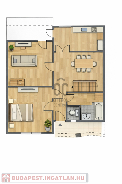 • földszinten: nappali, konyha, étkező, hálószoba, fürdő, külön WC, nagy terasz