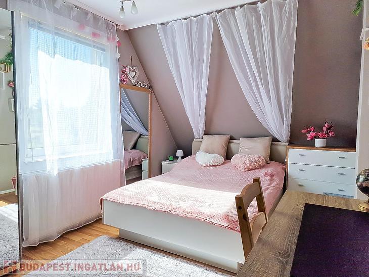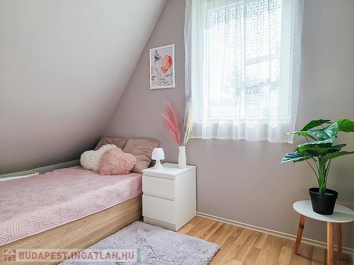 Az alsó szinten három tágas szoba, konyha, fürdőszoba, kamra és közlekedő található, míg a tetőtérben egy nappali, három hálószoba, konyha, kamra, fürdőszoba és közlekedő került kialakításra. A két szint jelenleg külön bejárattal rendelkezik, a tetőtér külső feljárattal van kialakítva, de belső lépcső kialakítására is van lehetőség.