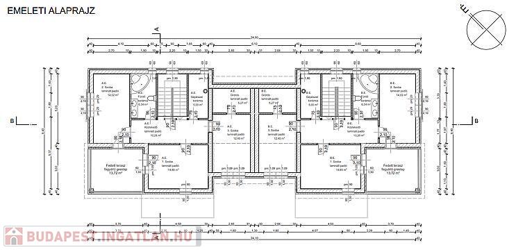 Emelet: 3 db Hálószoba, fürdőszoba, gépészeti helyiség és egy fedett terasz.
