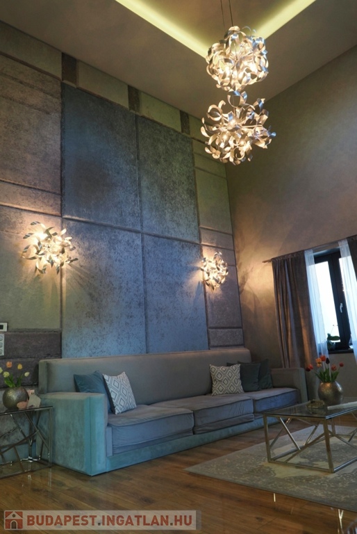 A ház fő éke a földszint izgalmas nappali-társalgó helysége, mely impozáns 6 métert meghaladó belmagasságával, kárpitozott falpanellel borított falával, a tökéletes komforthoz gyártott egyedi design bútoraival, és palakővel burkolt kandallójával magas fokon ad teret minden összejövetelnek.