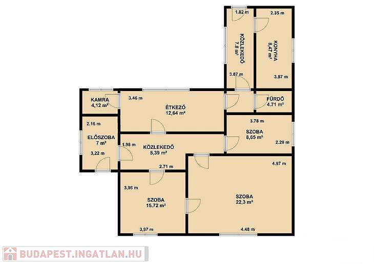 3 szoba, nappali, konyha, fürdőszoba kádas kialakítással + mellékhelyiség, előszoba, közlekedő, tároló.