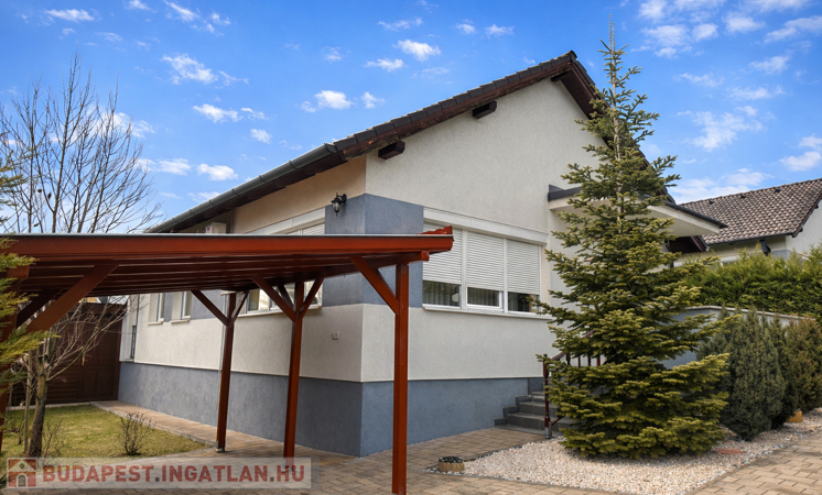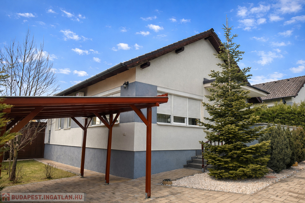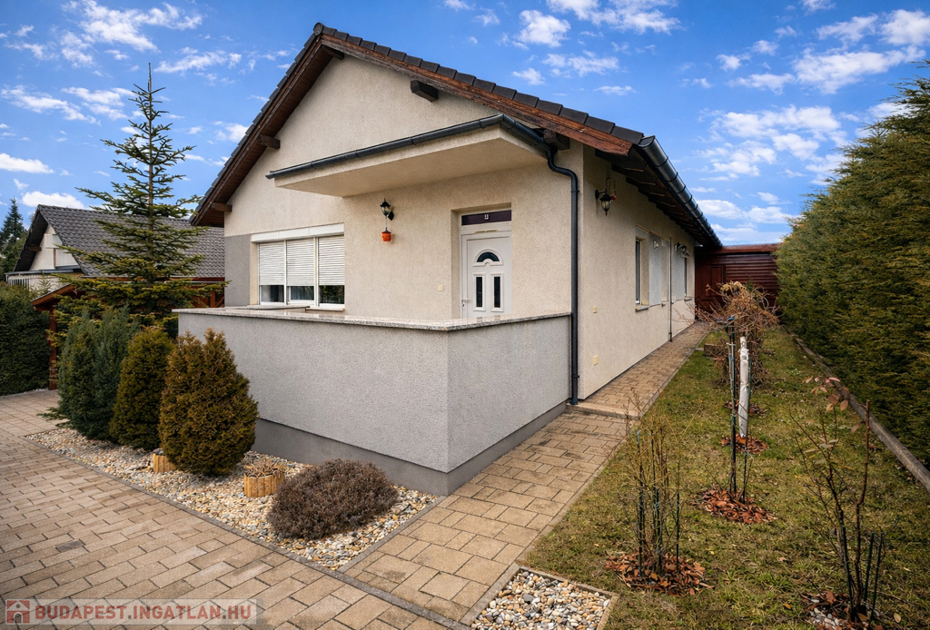 A bejárat egy 9,2m² teraszról nyílik,2 db melléképület található az ingatlan két oldalán,melyek közül a kisebbikben kézmosó és WC került kiépítésre. A nagyobb melléképület inkább tárolóként funkcionál. A ház déli -keleti és nyugati oldalakról nagy méretű redőnyös szúnyoghálós Aereco szellőztető rendszeres ablakokkal biztosítja a kellemes világos tereket. Riasztó berendezés, kaputelefon, szellőztető és öntöző rendszer teszik még komfortosabbá. Az ingatlan két oldalán könnyen karbantartható gondozott parkosított kert található,a környék csendes barátságos,a főváros 15 perc alatt elérhető kényelmesen.