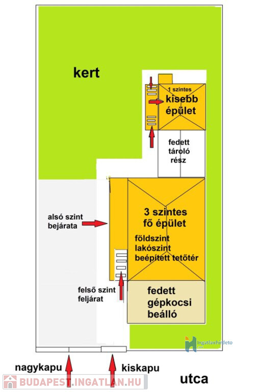 A telek hátsó részében kert van, a bejárati résznél pedig fedett gépkocsibeálló lett kiépítve.