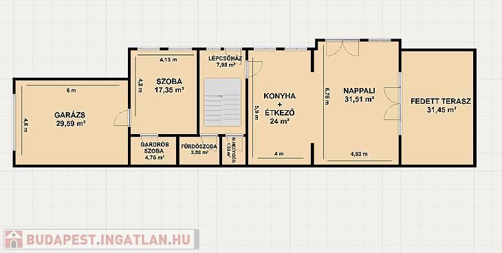 Előszoba, amerikai konyhás nappali, szoba, fürdőszoba, külön mellékhelyiség, gardróbszoba, fedett teraszkapcsolat.