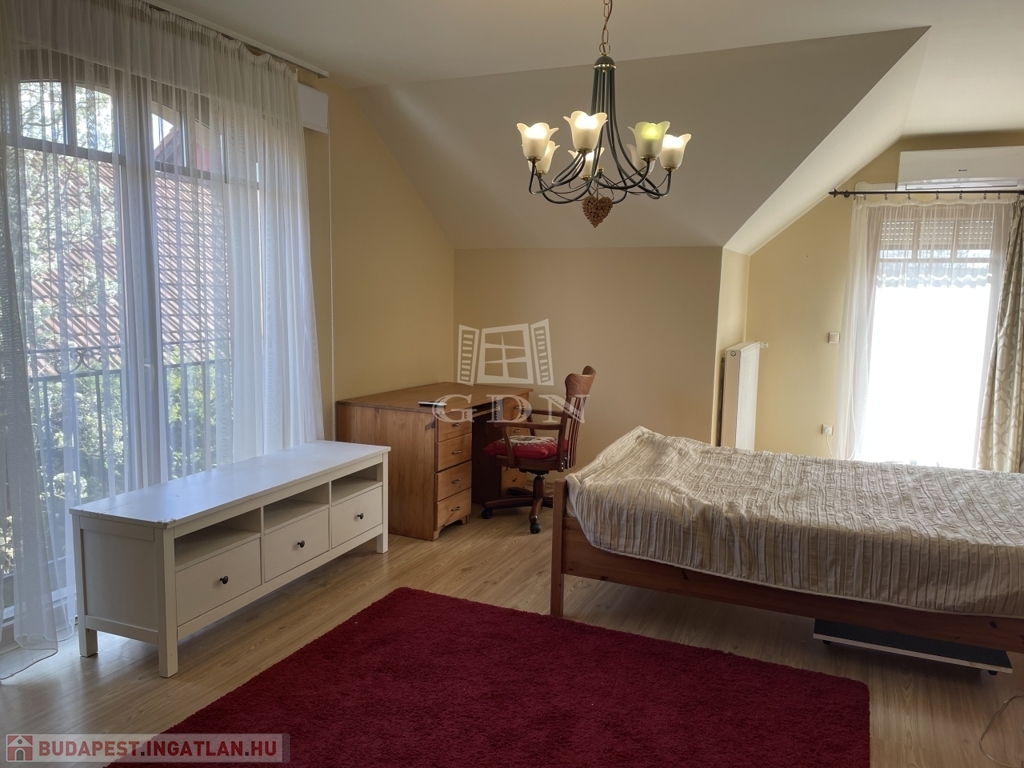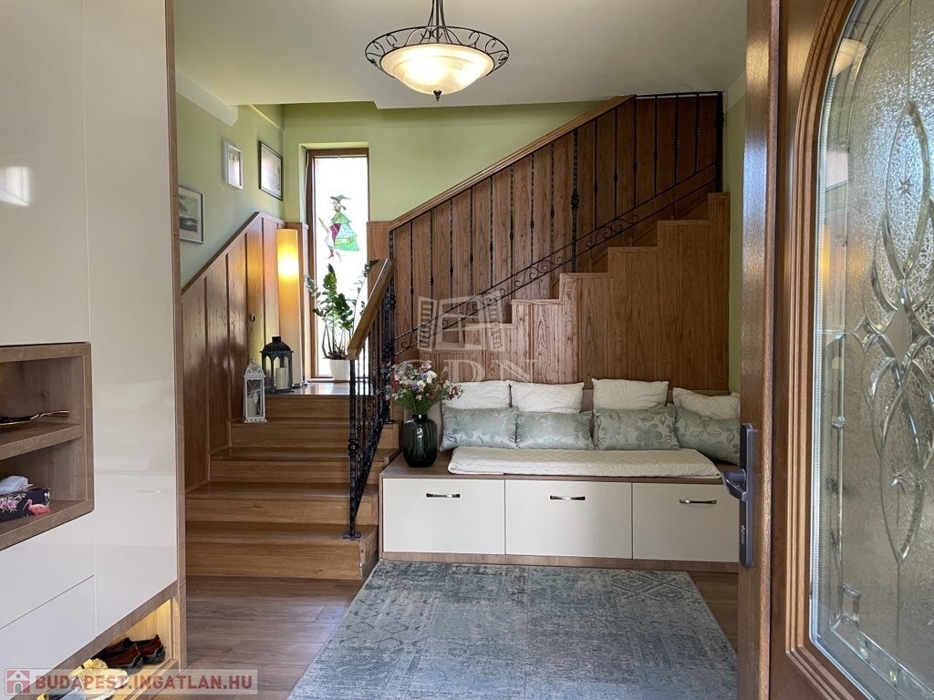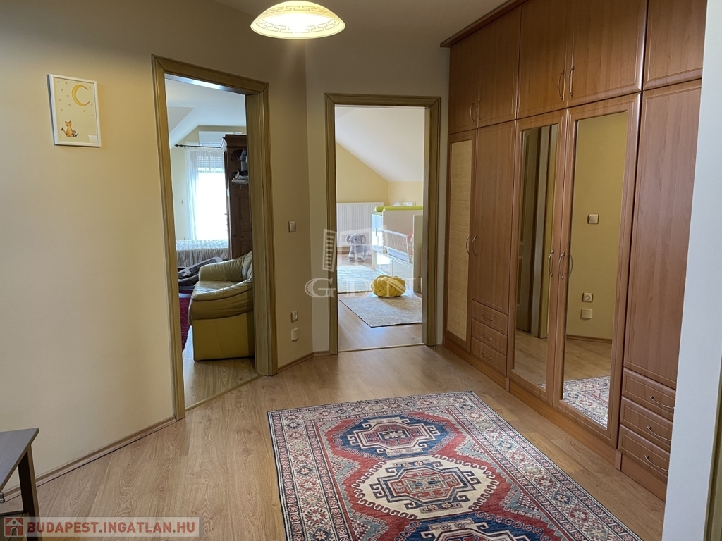 A klimatizált felső szintre, kényelmes fokkiosztású stabil lépcsőn juthatunk fel, ahol egy 19,4nm (nettó 18,5) közlekedő, három egyenként 17nm (nettó 13,2), 23,2nm (nettó 20,2) és 18nm (nettó 15,5) szoba, valamint egy 6nm (nettó 5) gardrób és 7,1nm (nettó 5,2) fürdőszoba került kialakításra.