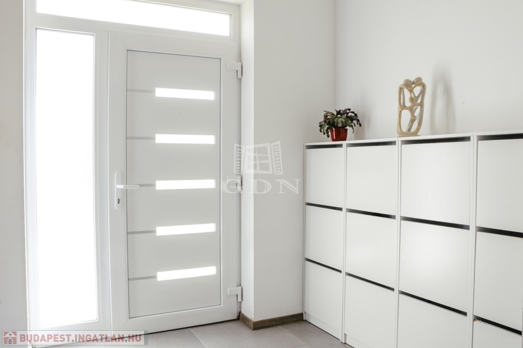 A műszaki tartalom a laikus szem számára visszafogott, a hozzáértők számára azonban egyértelmű: komoly hőszigetelés, Rehau háromrétegű nyílászárók, elektromos redőnyök, padlófűtés kondenzációs kazánnal, kiegészítve nagy teljesítményű, H tarifára alkalmas klímaberendezésekkel.