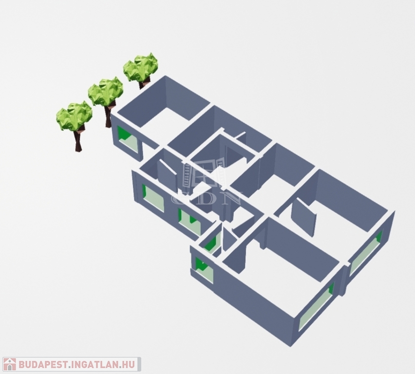 Felosztása: közlekedő, fürdőszoba, 2 különálló szoba, egy szoba, amely hallként funkcionál jelenleg (nincs rajta ablak, azonban kisebb átalakítással, könnyedén ablakossá alakítható), egy nagy méretű konyha, étkezővel, és egy közel 12 nm nagyságú háztartási helyiség.
