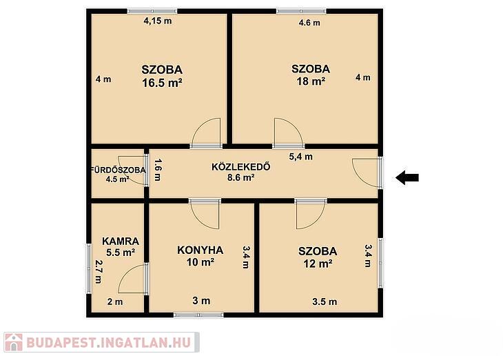 3 szoba, étkezős konyha, kamra, zuhanyzós fürdőszoba + wc, közlekedő.