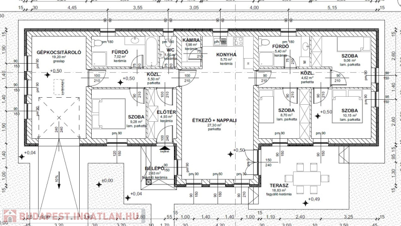 Vasbeton sávalap, 30 cm-es Porotherm tégla főfalak 12 cm-es dryvit hőszigeteléssel. Műanyag homlokzati nyílászárók 3 rétegű üveggel. Fa födém 30 cm. kőzetgyapot hőszigeteléssel. Bramac cserép héjalás. Festés, burkolás, szaniterek, belső ajtók választhatók. A hideg, meleg burkolatokat 6000 Ft./m2 árig, a belső ajtókat 75000 Ft./db. árig tartalmazza a vételár. Mosdó csaptelep: 25 ezer Ft., mosdó: 25. ezer Ft., Kádtöltő csaptelep: 40 ezer Ft., Fürdőkád: 100 ezer Ft., Zuhany csaptelep szett: 40 ezer Ft. Zuhanykabin épített zuhanyhoz: 200 ezer Ft., WC csésze: 25 ezer Ft. (beépített tartályos wc-k kerülnek kialakításra)