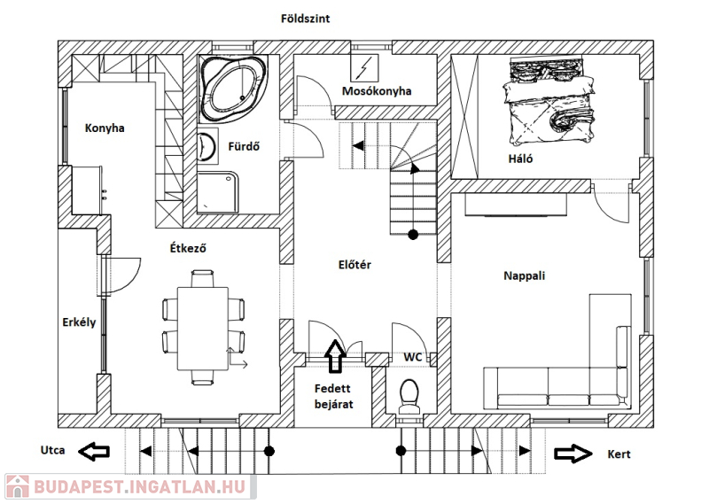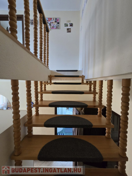 - földszint: hatalmas előszoba, elszeperált konyha – étkező, nappali, szülői háló, WC, mosókonyha, és egy nagyméretű fürdőszoba káddal és zuhanyzóval