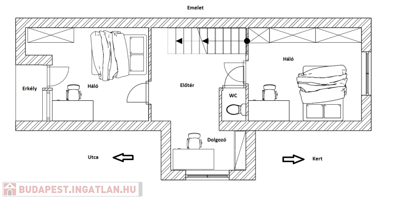 - emelet: előtér, 2 nagyméretű szoba, dolgozó sarok, WC