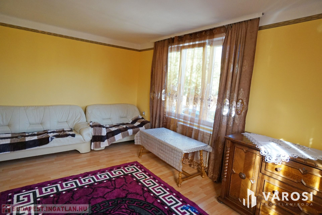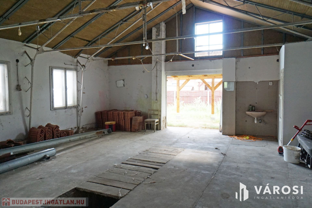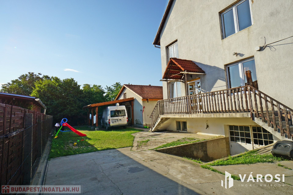 160 m2-es családi ház, 70 m2 pincével, 60 m2-es melléképülettel.