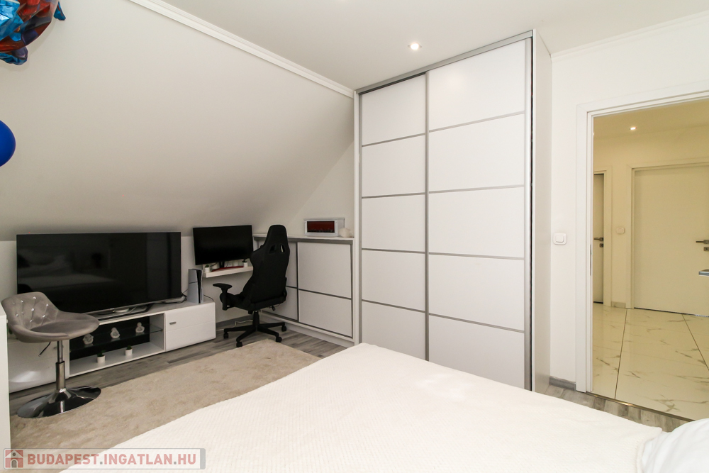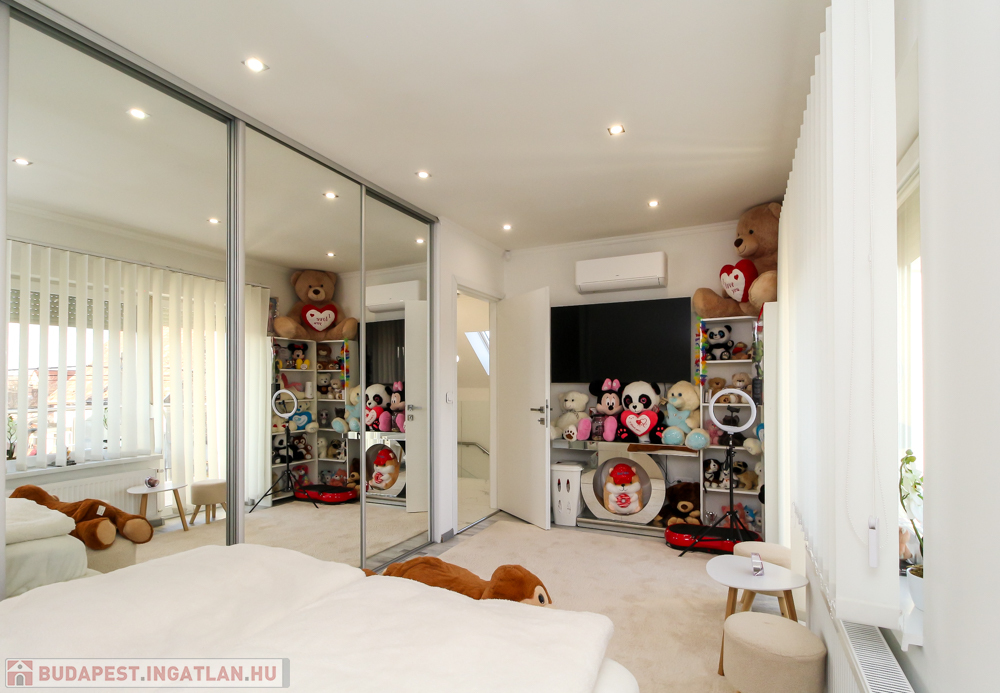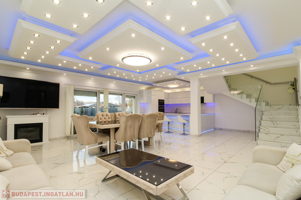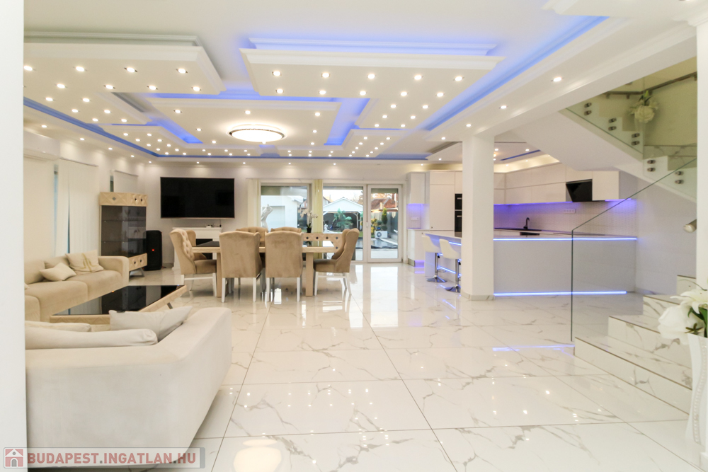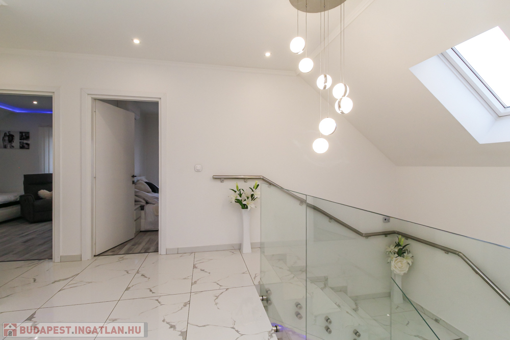 A sík telken fekvő családi ház kiemelkedik a kertváros többi ingatlanai közül külső megjelenésében, mégis visszafogott, nem hivalkodó. A bejárati ajtón belépve a 60 nm-es impozáns nyitott konyha nappali együttese tárul elénk, ami a belső nettó 172 nm-es kétszintes ház központja és kapcsolódik hozzá egy 17 nm kertre néző terasz.