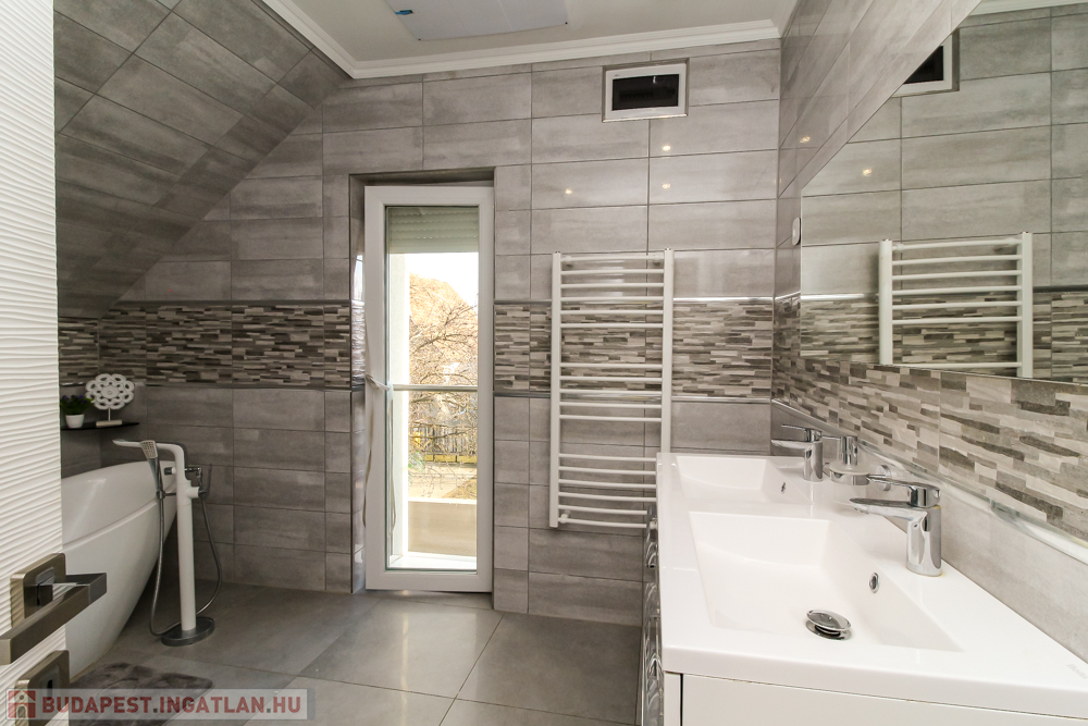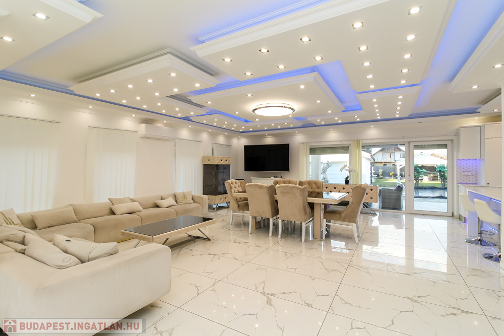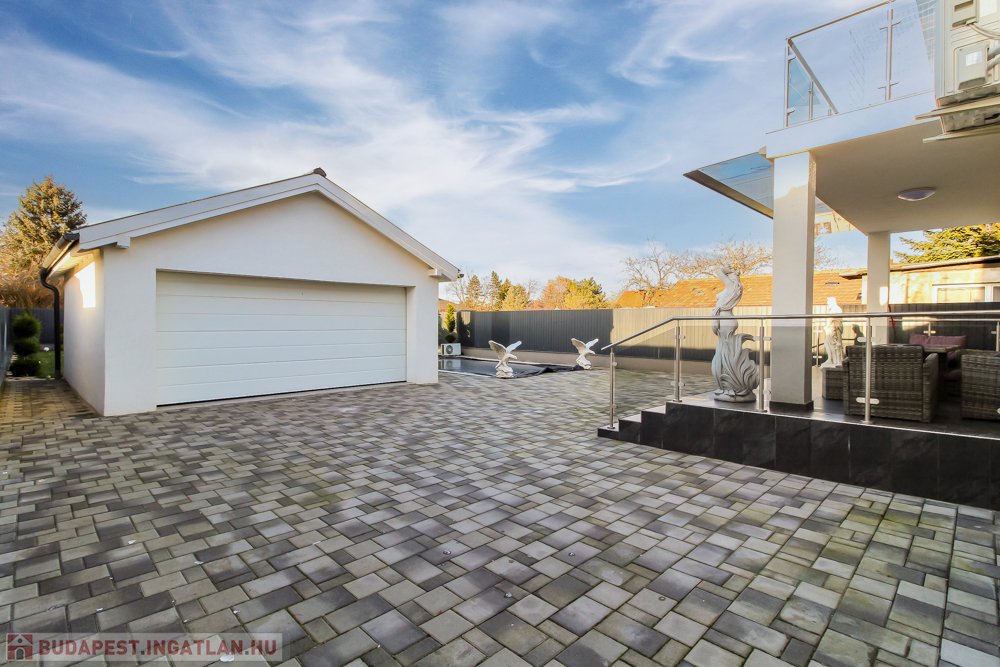 Kertje az otthoni kikapcsolódást maximálisan kiszolgálja. Dísznövényekkel tarkított és dekorvilágítással felszerelt, az automata öntözőrendszer wifi-ről vezérelhető. A 4 x 7 méteres medence természetesen fűthető, a 25 nm-es filagória alkalmas grillezésre, családi összejövetelek megtartására. A 42 nm-es fűthető garázsban 2 autó kényelmesen elfér.